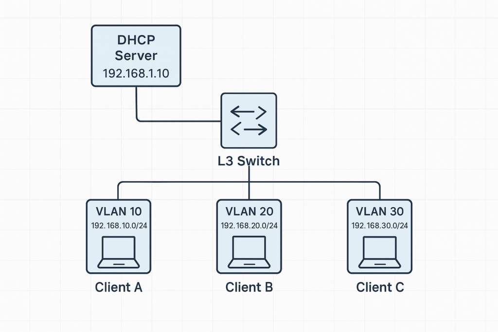 การตั้งค่า Layer 3 Switch (L3 Switch) ให้ทำงานร่วมกับ DHCP Server (ไม่ว่าจะเป็นภายใน switch เองหรือจากภายนอก เช่น server ที่แยกต่างหาก) จำเป็นต้องมีการกำหนด VLAN Interface (SVI) และการใช้คำสั่งช่วยในการ forward DHCP request (เช่น DHCP relay) ไปยัง server ที่อยู่ต่าง subnet ได้