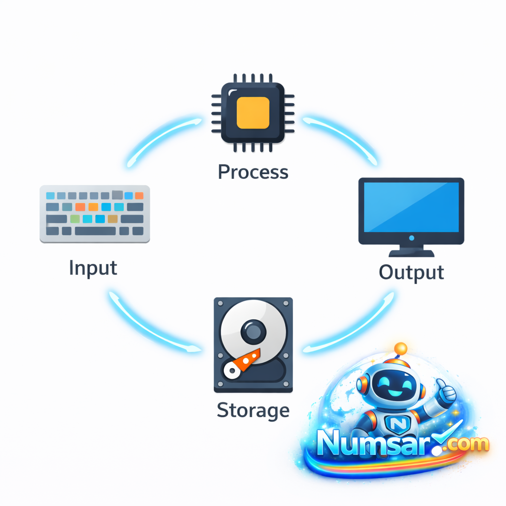 - Input (รับข้อมูล) เหมือนคุณสั่งอาหารกับพนักงานเสิร์ฟ ในทางคอมพิวเตอร์คือการที่เราป้อนข้อมูลหรือคำสั่งเข้าไป เช่น การพิมพ์คีย์บอร์ด, การคลิกเมาส์, การสัมผัสหน้าจอ หรือการพูดใส่ไมโครโฟน